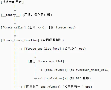 · 原理:使用ftrace_ops结构体来封装不同的追踪行为(如记录到环形缓冲区、调用BPF程序等)。所有活跃的ftrace_ops被组织成一个RCU保护的链表。