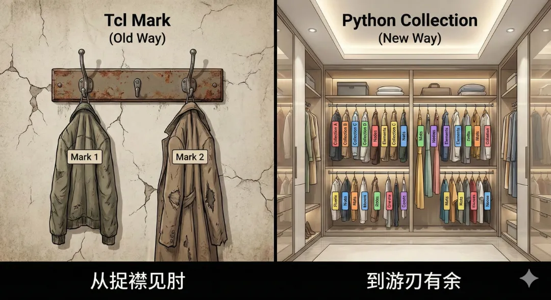 1. 痛点:被 *createmark 支配的恐惧在 Tcl 时代,我们像是在玩杂耍,手里只能同时扔两个球(Mark 1 和 Mark 2)。如果你想做这件事:“选中 A 集合,减去 B 集合,再和 C 集合取交集”,在 Tcl 里你得写几十行代码来倒腾这两个 Mark ID。