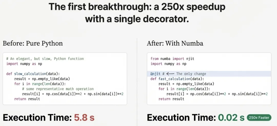 - Numba JIT 编译器:更像一位专业笔译员,他会先完整地阅读整个段落(你的函数),理解其含义和上下文,然后将其翻译成一篇精炼、优美的文章(优化的机器码)。之后,每次需要时,你都可以直接阅读这篇已翻译好的文章,速度飞快。