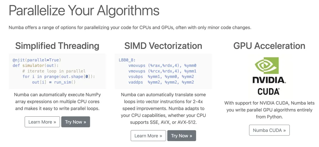 parallel=True 等选项实现并行化),还能使用 @cuda.jit 将函数编译为在 NVIDIA GPU 上运行的 CUDA 内核,从而利用大规模并行计算的能力。