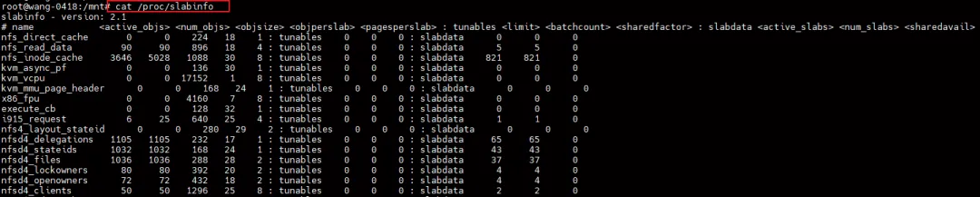 /proc/slabinfo 是内核暴露的一个“内核对象分配统计表”,它记录了所有 slab cache 的当前状态。