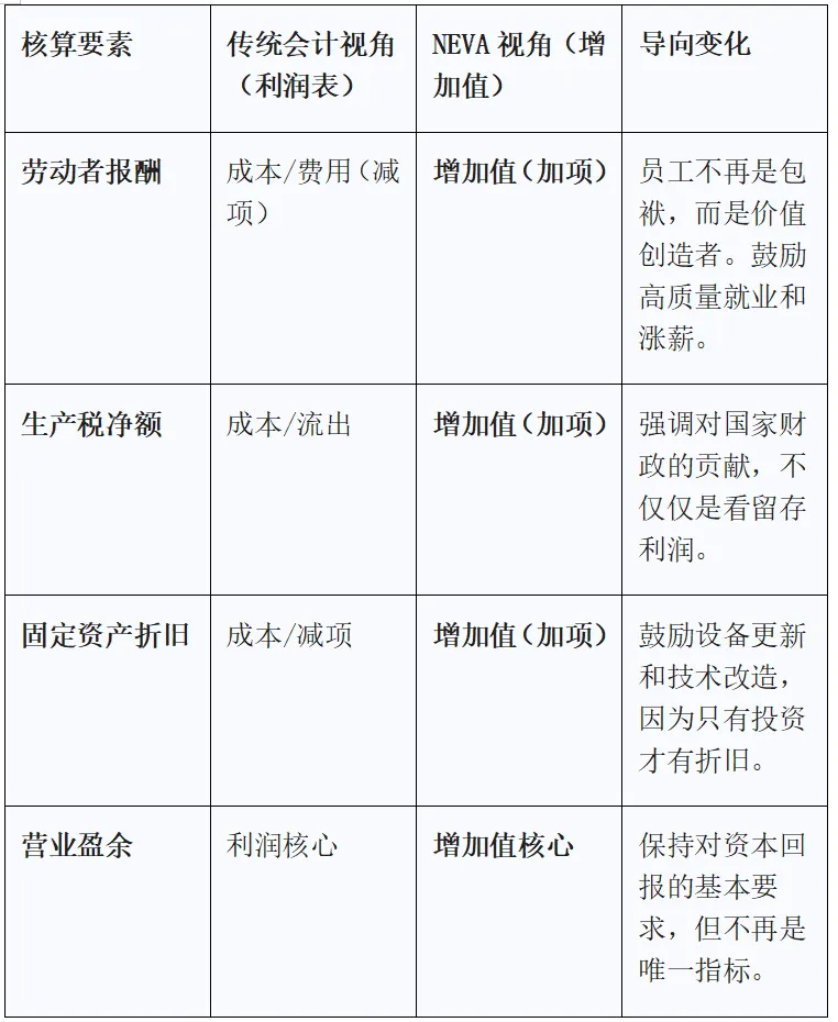 国有经济增加值(National Economic Value Added, NEVA)引入了更宏观的视角,盯住的是国有经济对新创价值的提升。虽然具体公式在不断完善,但其核心逻辑采用收入法核算,与传统的EVA(经济增加值)既有联系又有区别。