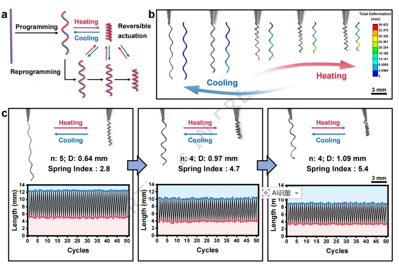 图4:由动态键交换实现的Janus纤维可重编程驱动行为。 (a)示意图展示Janus纤维中通过动态共价键交换实现的可逆热驱动与可重编程结构重构之间的协同作用。(b)在循环加热(70°C)与冷却(25°C)下,松散与紧密螺旋构型之间可逆驱动的实验演示及相应的有限元分析。(c)经过重编程的、具有三种不同螺旋几何形状(展示不同螺旋圈数和弹簧指数)的Janus纤维的驱动循环。所有示意图中,蓝色代表LCE,红色代表PU。