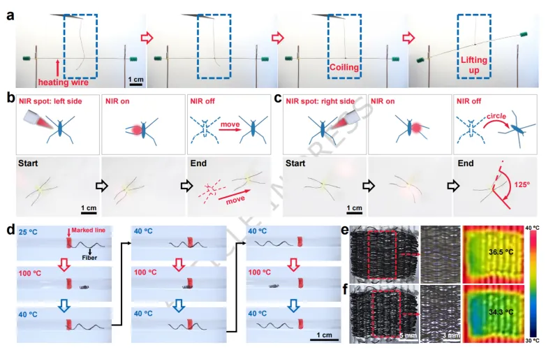 在功能演示方面(图5),Janus纤维展现出多模态驱动能力。受植物卷须启发,纤维能在局部加热(如接近90°C热丝或近红外激光照射)时自发卷曲,实现物体的抓取与释放(图5a)。研究人员还设计了以Janus纤维为腿的“水黾”机器人,通过激光选择性照射不同朝向的“腿”,能实现定向移动(图5b)或可控旋转(图5c)。此外,具有梯度螺旋结构的弹簧状纤维在受限管道中可通过热循环实现尺蠖式定向爬行(图5d)。最后,Janus纤维可被编织进智能织物(图5e),当织物被拉伸时,纤维发生螺旋转变,增加织物孔隙率,从而可逆地显著提升其隔热性能(图5f),展现了在自适应热管理穿戴设备中的应用前景。
