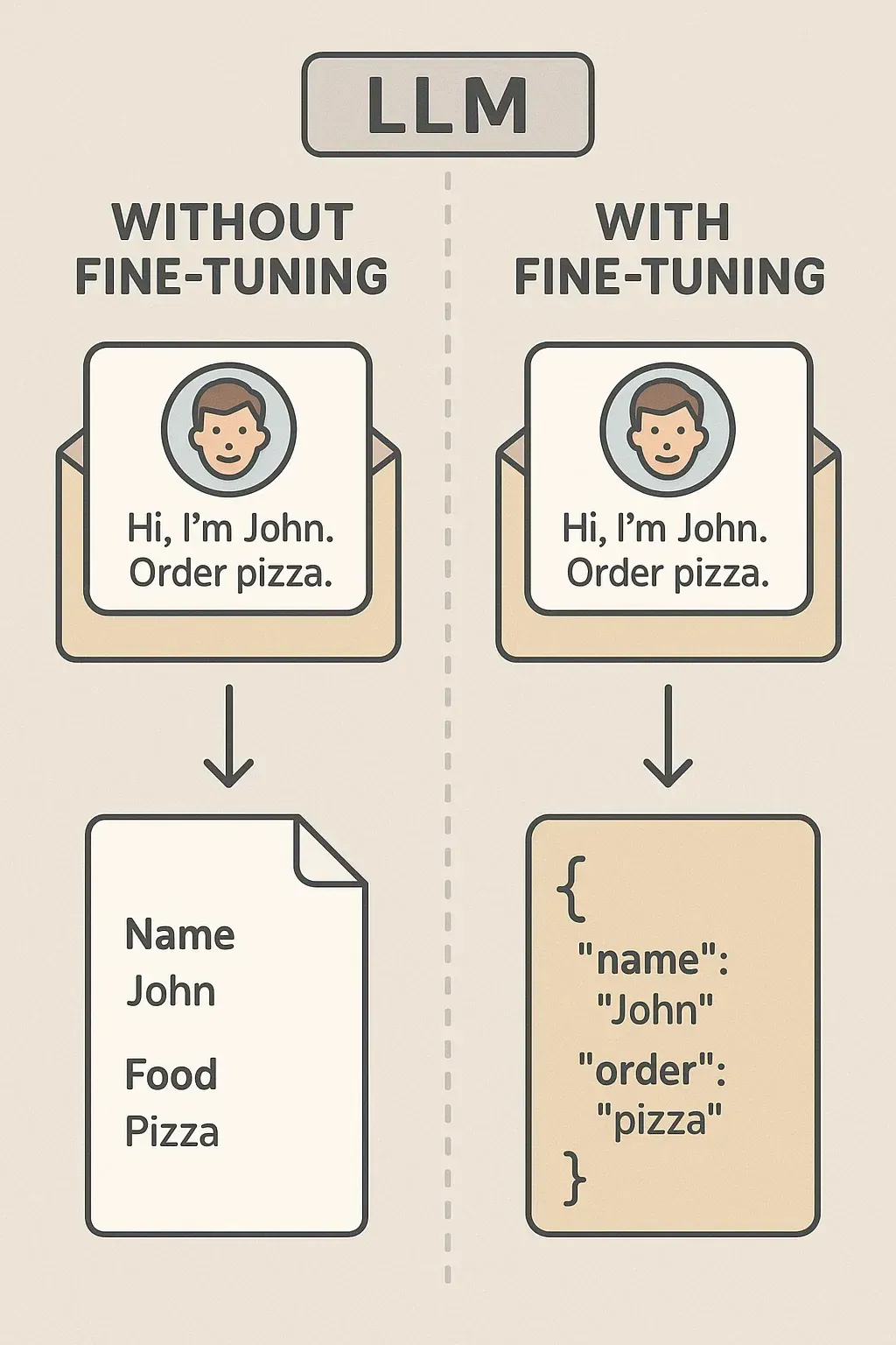 未微调: 提示词:“从 ‘Hi, I’m John. Order pizza.’ 中提取姓名和订单。” 输出:可能不稳定,比如“Name: John, Food: Pizza”,或者只是一个摘要。