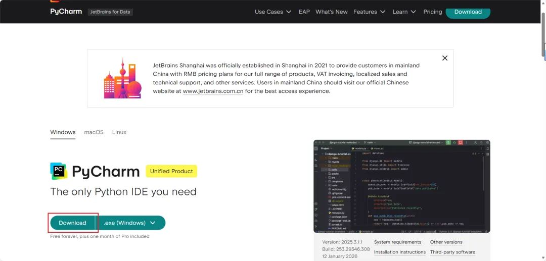 访问官网下载:Download PyCharm: https://www.jetbrains.com.cn/en-us/pycharm/download/?section=windows