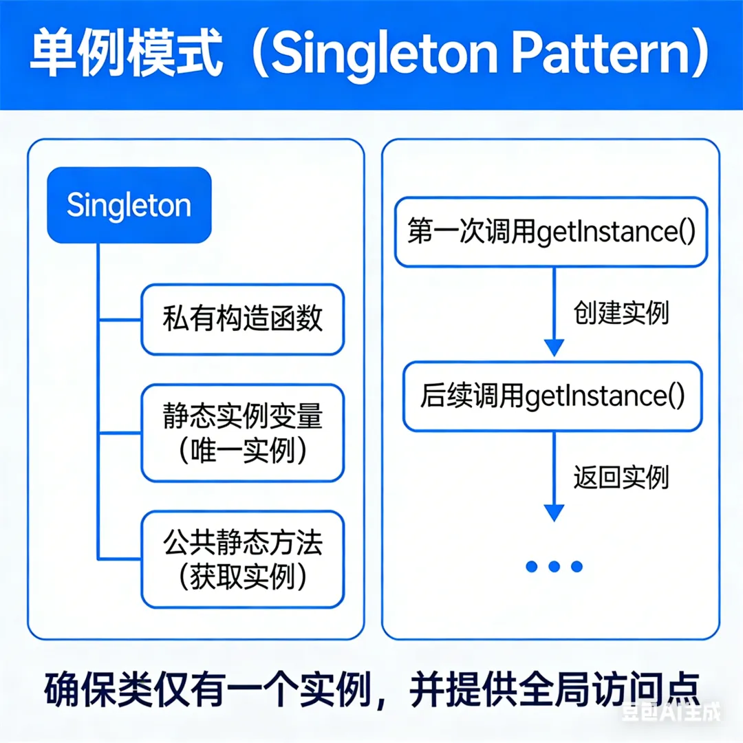 基础要点:核心是“私有构造方法+全局静态方法”,禁止外部随意创建实例,只允许通过指定方法获取唯一实例。