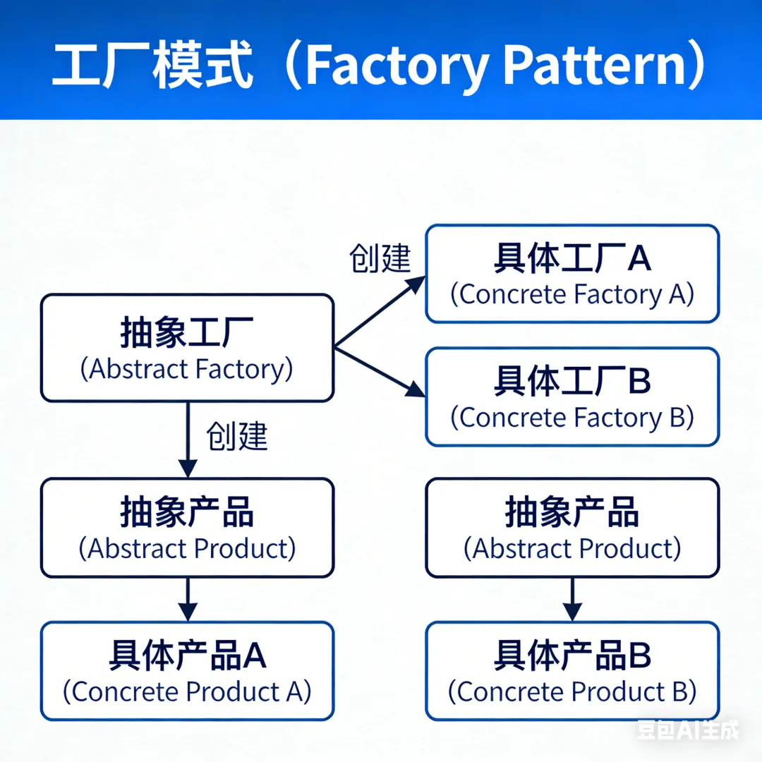 核心思想:将对象的创建逻辑与使用逻辑分离,由“工厂类”统一负责创建对象,调用者无需关心对象的创建细节,只需根据需求向工厂请求即可。