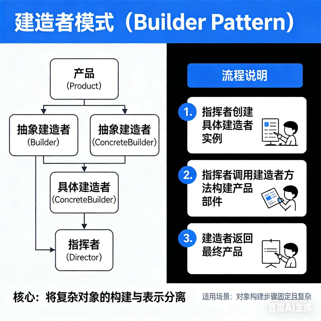 核心思想:将复杂对象的创建过程拆分成多个步骤,允许按照不同的顺序或配置,逐步构建出不同的对象,重点关注“对象的构建步骤”。