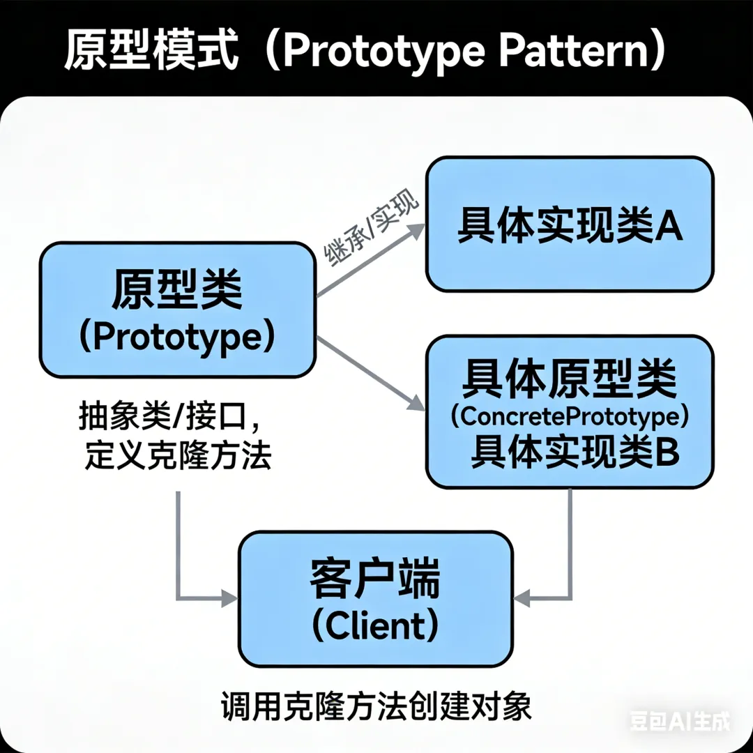核心思想:利用已有的对象(原型),通过“复制”的方式创建新对象,无需重新执行创建逻辑,提高对象创建效率,尤其适合创建复杂对象。