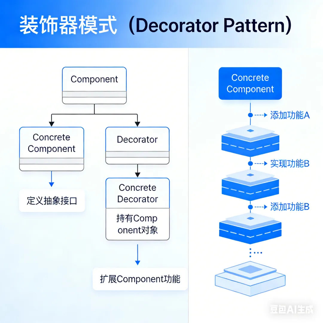 核心思想:在不修改原有类代码的前提下,动态地给对象添加新的功能,通过“装饰器类”包裹原有对象,层层添加功能,实现功能的灵活扩展。