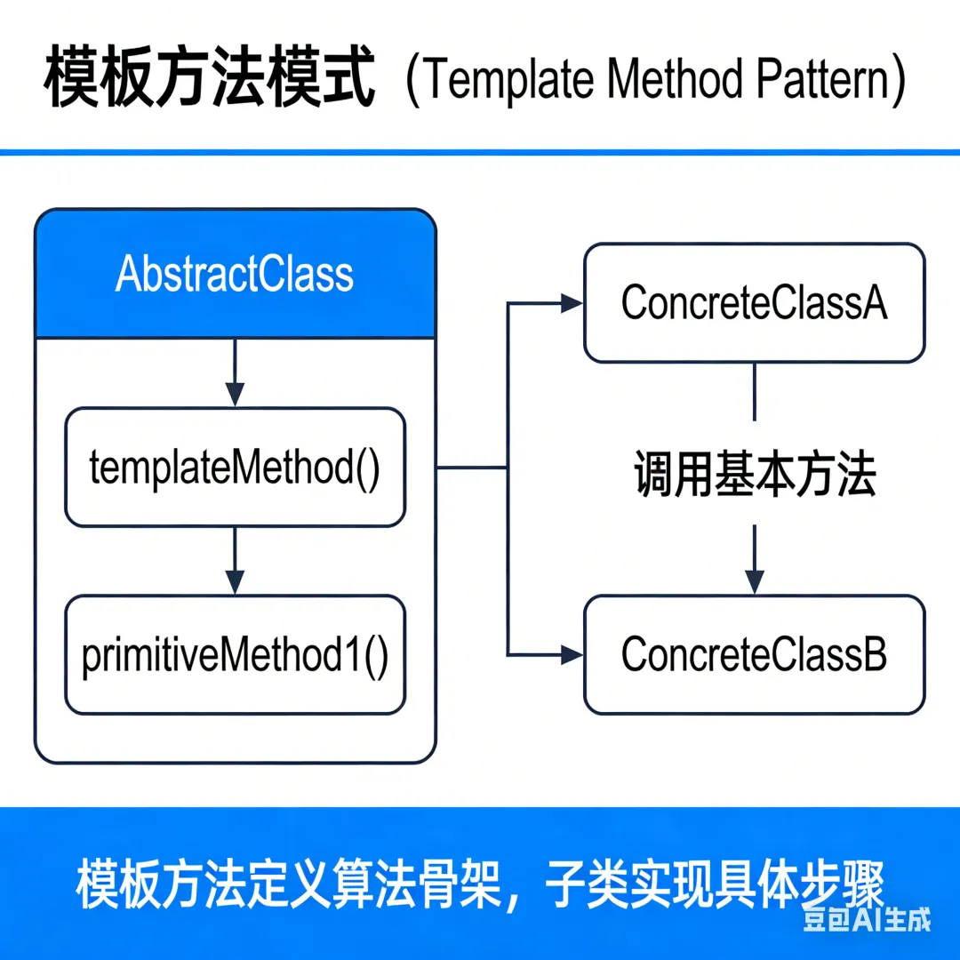 核心思想:定义一个“算法模板”(抽象类),将算法的核心步骤固定下来,其中部分步骤延迟到子类中实现,子类可以修改具体步骤,但不能改变算法的整体流程。