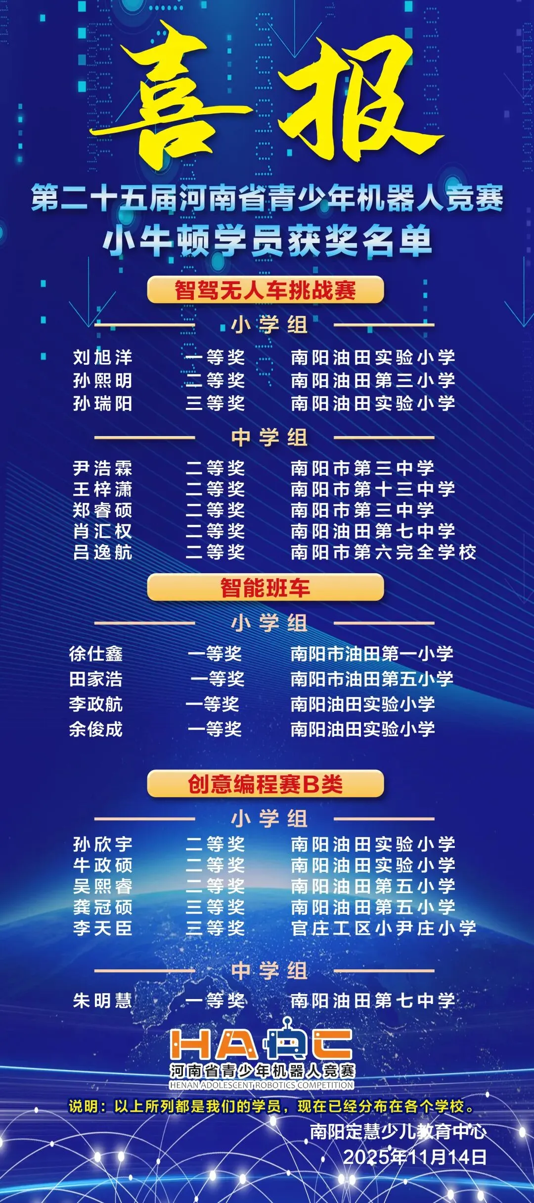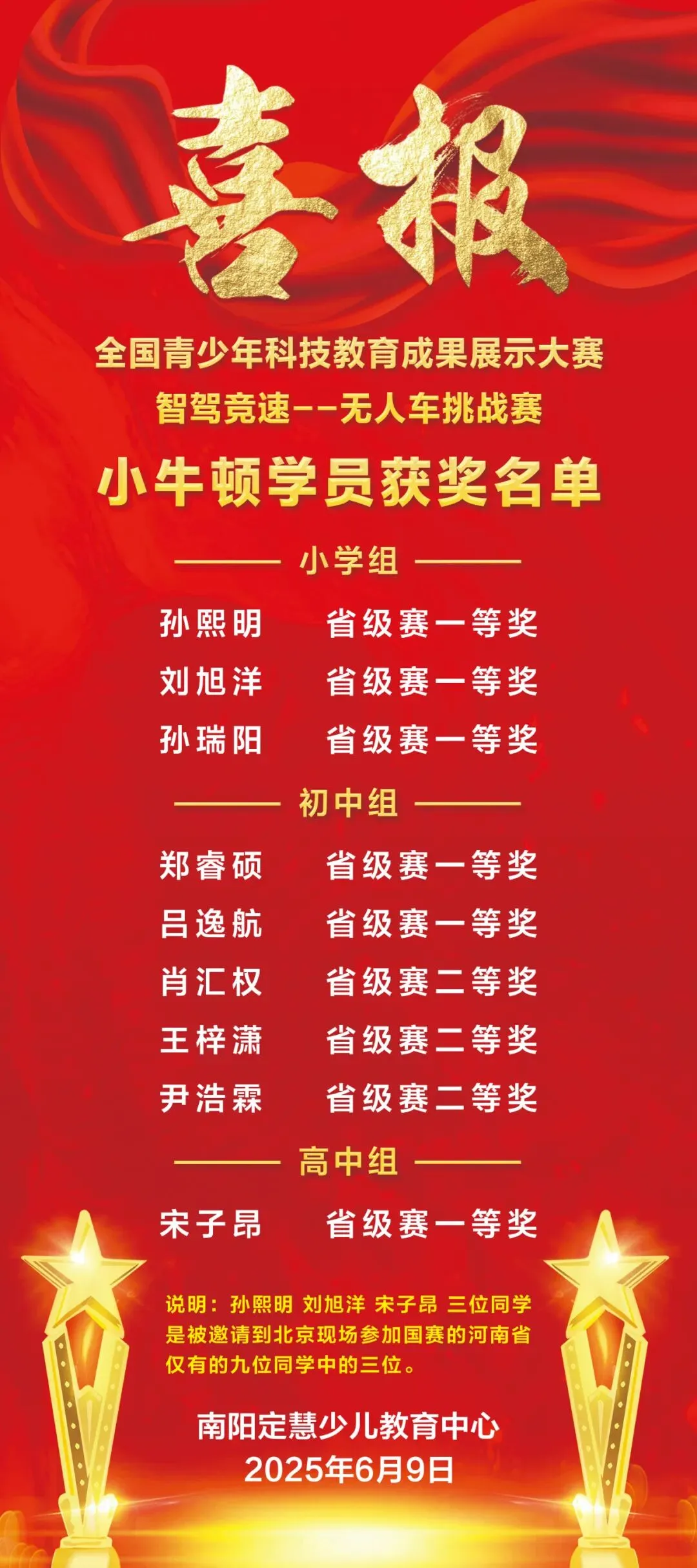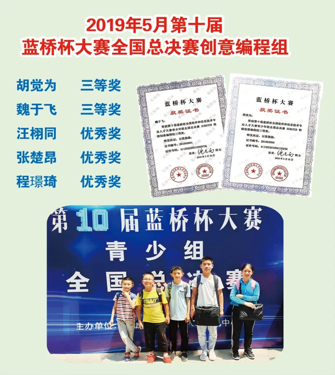 我们组织学员积极参加各个级别和诸多类型(编程、创客、机器人、人工智能、科技创新、信息素养等等)的比赛,参赛成果颇为丰硕,现展示于此,请大家了解。特别是我们于2025年获得了两个小学组国家级一等奖和一个高中组二等奖(详见下面喜报),真正诠释了“实力演绎精彩 荣誉见证辉煌”!