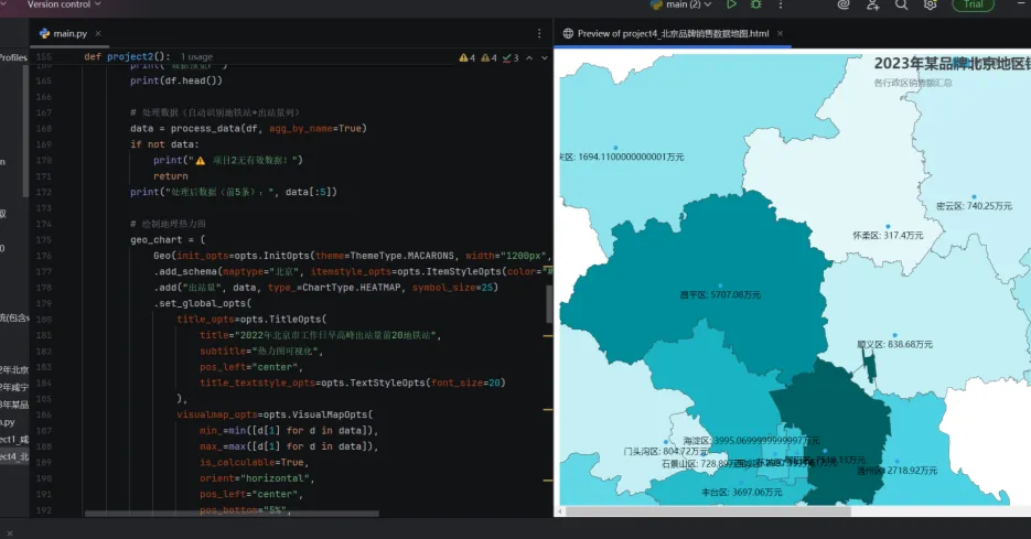 它不是“炫技”,而是让数据“开口说话”的工具——政府用它规划地铁线路,商家用它选开店地址,普通人用它看懂城市的运转规律。我们用真实代码和效果,看看数据可视化能解决哪些问题:问题 :北京16个区县的常住人口分布差异大,光看表格里的数字没感觉。技术 :用Python的Pyecharts库读取Excel数据,生成交互式地图。效果 :颜色越深的区域人口越多,鼠标悬停还能显示具体人数。比如朝阳区、海淀区的颜色明显更深,直观反映了人口聚集的特点。问题 :早高峰哪些地铁站最挤?只看进站人数的数字,很难想象拥挤程度。技术 :用Pyecharts的Geo组件,把进站量转化为热力点,颜色越红代表人流越大。效果 :国贸、西二旗这些通勤大站呈现出明显的红色热点,一眼就能看出“早高峰战场”在哪里。技术 :读取区县GDP数据,用Map组件生成渐变色彩地图。效果 :赤壁市、咸安区的颜色偏红(GDP更高),通山县、通城县颜色偏蓝(GDP较低),区域经济差异一目了然。技术 :结合分店经纬度和销售额数据,生成带气泡的热力图。效果 :海淀区、朝阳区的气泡更大且颜色更深,说明这些区域是品牌的核心市场。这是我们案例里用到的工具,用Python写几行代码就能生成交互式地图、图表,还能导出HTML文件分享。from pyecharts.charts import Mapfrom pyecharts import options as optsdata = [["朝阳区", 345], ["海淀区", 312], ["西城区", 256]]map_chart.add("常住人口(万人)", data, maptype="北京")map chart.set global opts(title opts=opts.TitleOpts(title="北京各区县人口分布"))map_chart.render("北京人口地图.html")拖放式操作,不用写代码就能生成专业图表,适合职场人快速做汇报。- 别为了“好看”牺牲清晰 比如用3D地图展示二维数据,反而会让读者看不清重点,像我们案例里的平面热力图就足够直观。