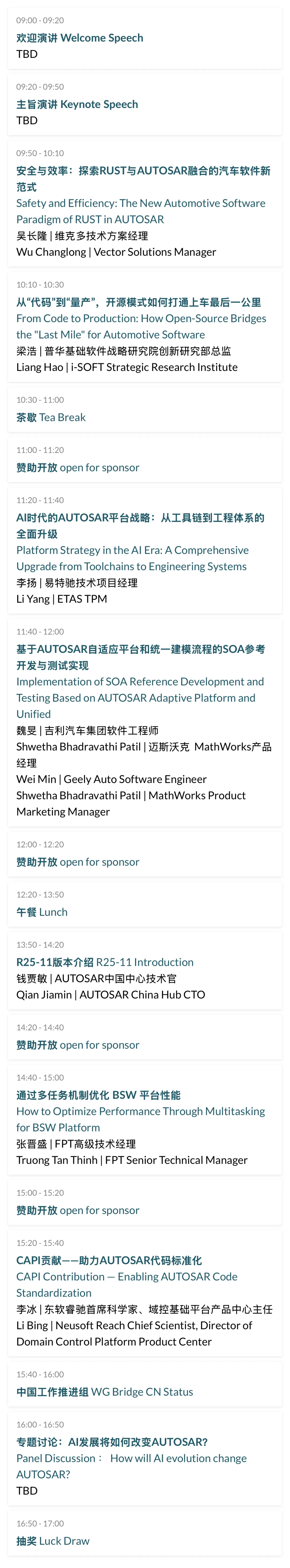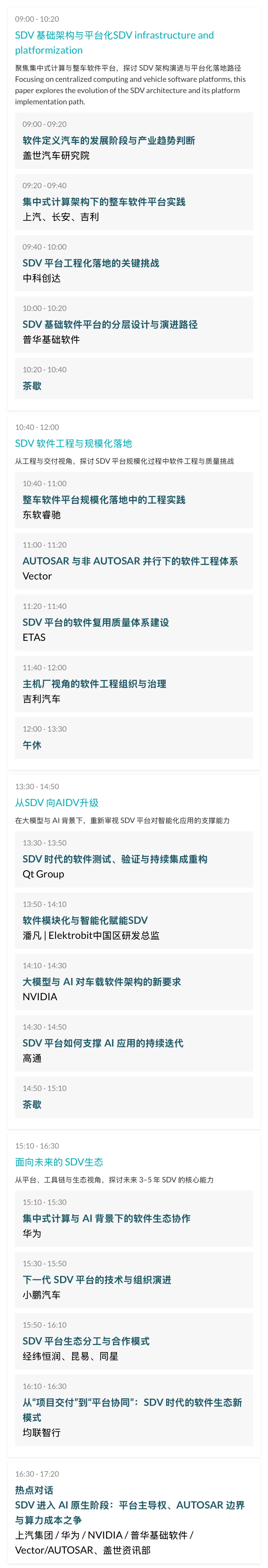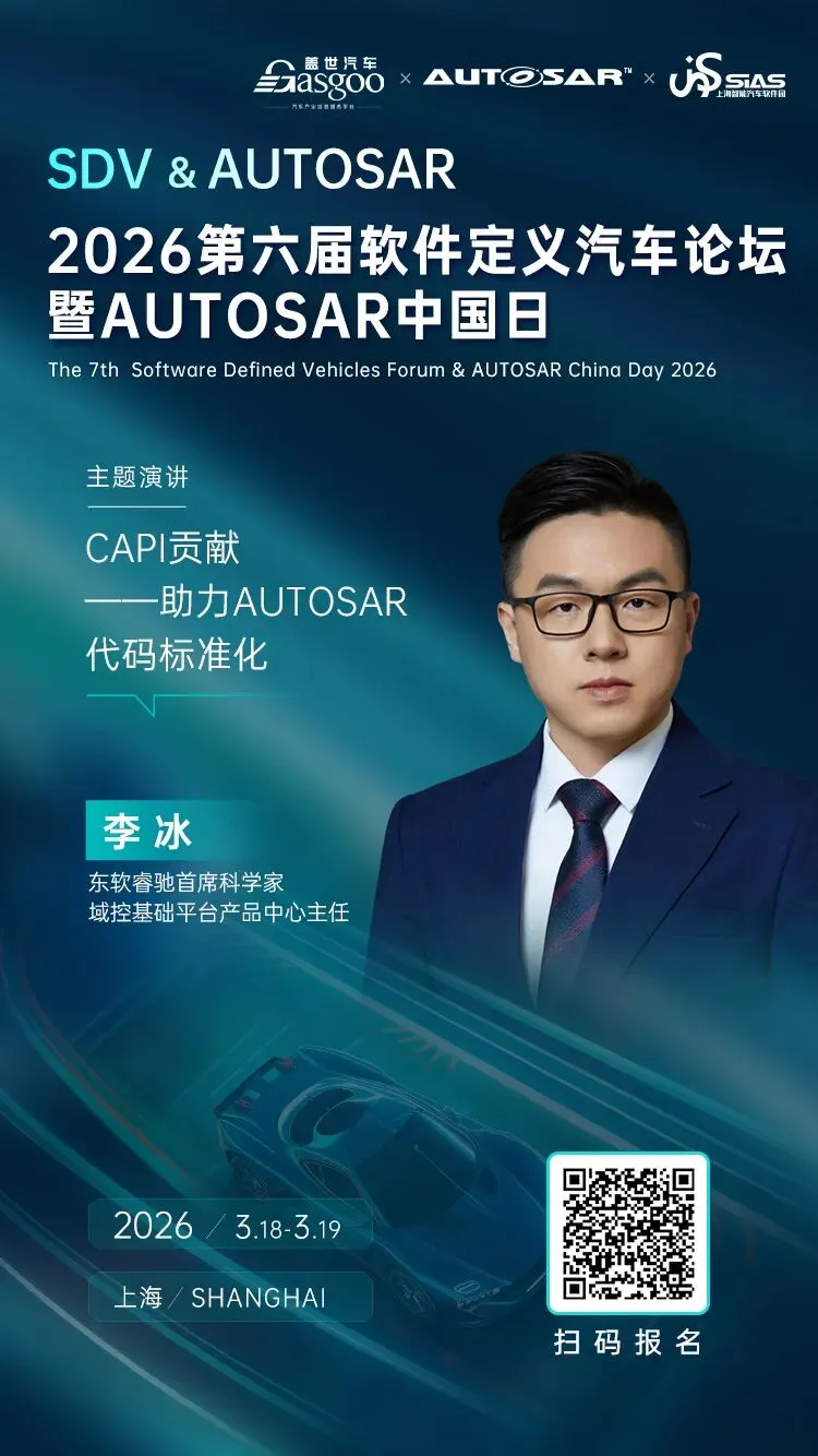 在此背景下,盖世汽车2026第七届软件定义汽车论坛暨AUTOSAR中国日将聚焦软件定义汽车,围绕车载通信解决方案、SOA架构、车云计算、智驾域中间件、高性能计算软件平台等行业焦点进行讨论。在AUTOSAR中国日活动中,多位专家也将围绕AUTOSAR中国区发展、AUTOSAR新发布功能等话题进行分享,共同探讨未来汽车软件技术趋势。