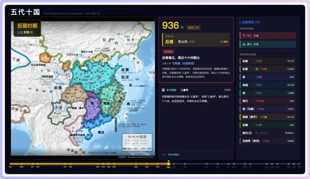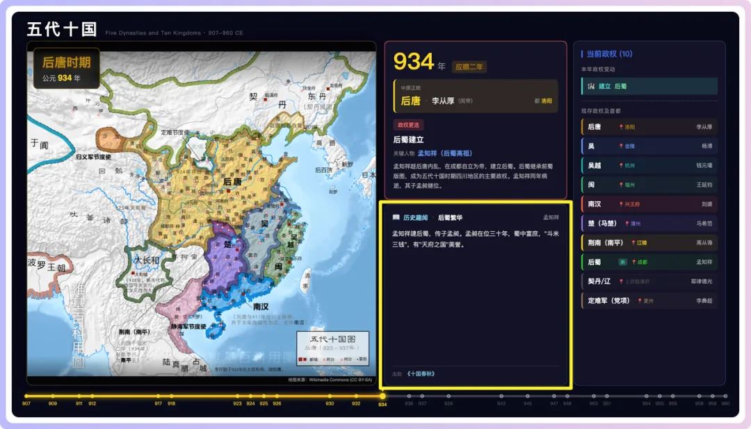 所以我自己做了一个视频,把五代十国整个时期(907-960年)每一年的变化都可视化出来,想让大家能直观地看到当时正在发生什么。