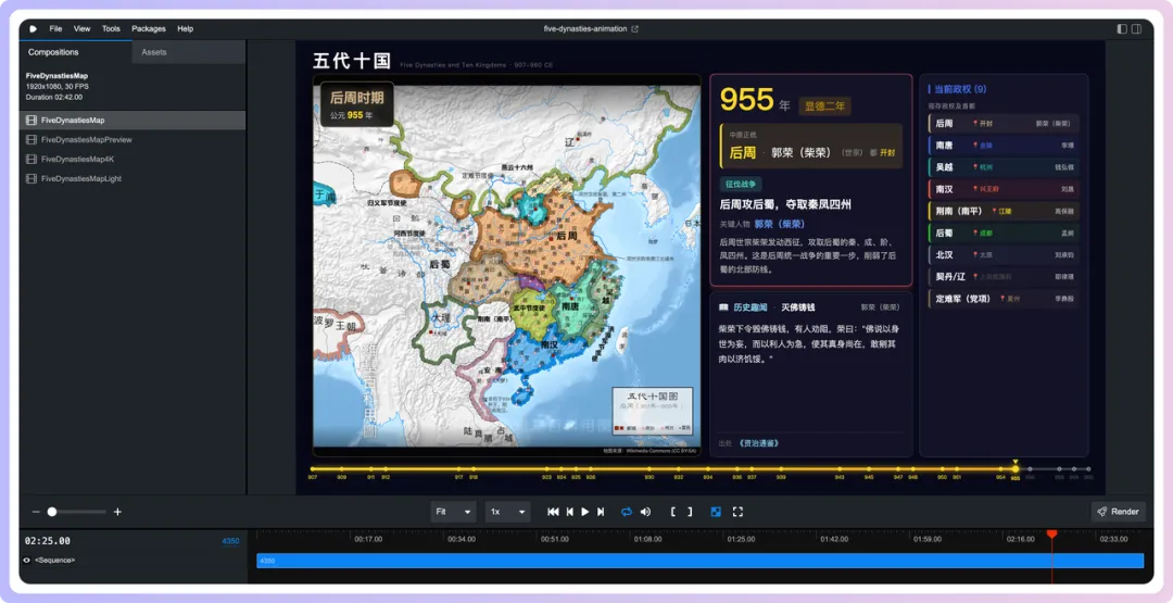 Remotion 的思路不一样:用代码定义规则,让程序自动生成每一帧。我只要告诉它从数据里取当年的皇帝名字显示出来,它就会自动处理54年的内容。