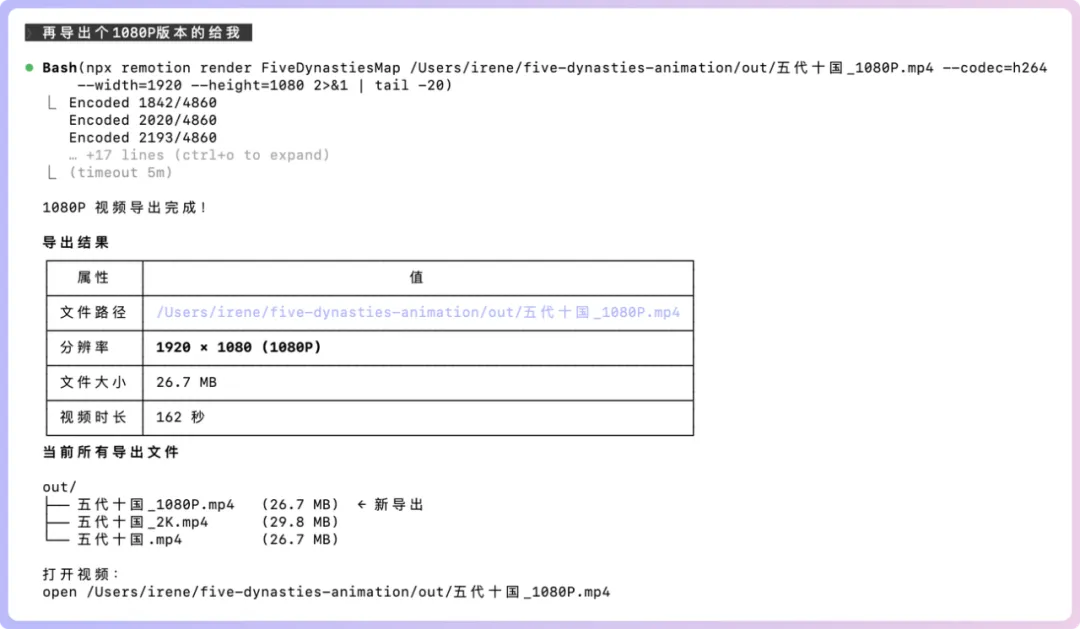 直接让 Claude Code 帮我执行导出命令,比在Remotion Studio 里面手动操作快得多。我说按照一倍速的节奏导出视频就出 1080p ,其他尺寸也一样,说导出 2K 的视频也会直接执行。不用自己研究命令行和提示词怎么写,说人话就行。