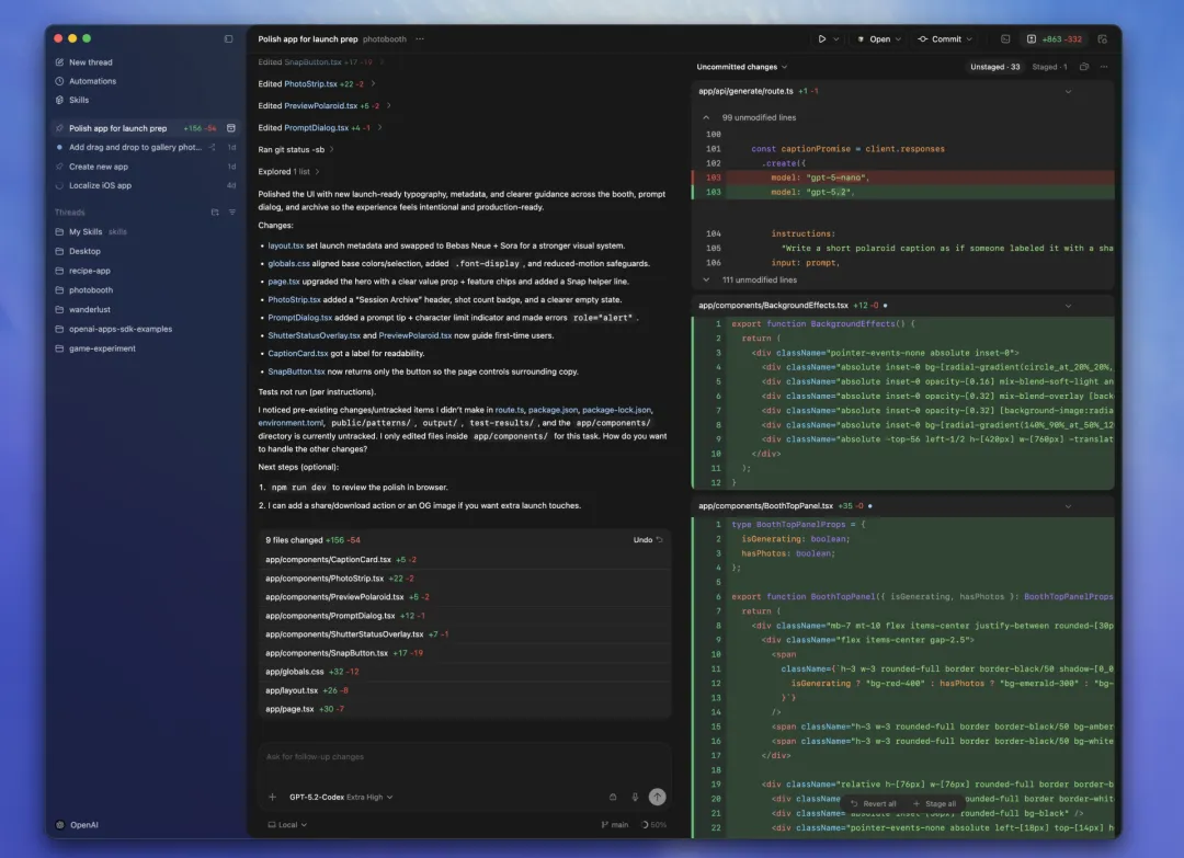 多智能体并行工作(Threads + Projects)应用将智能体的工作组织在按项目划分的线程中。你可以在不同任务间快速切换而不丢上下文,在应用内直接查看智能体改动的 diff、发表评论,也可在本地编辑器中手动修改。