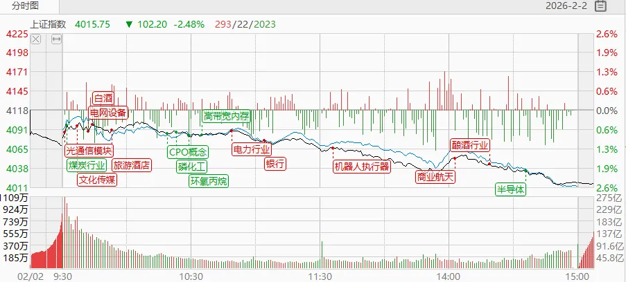 A股三大指数2月2日集体大跌,截止收盘,沪指跌2.48%,收报4015.75点;深证成指跌2.69%,收报13824.35点;创业板指跌2.46%,收报3264.11点。沪深京三市成交额26069亿,较上一交易日缩量2558亿。