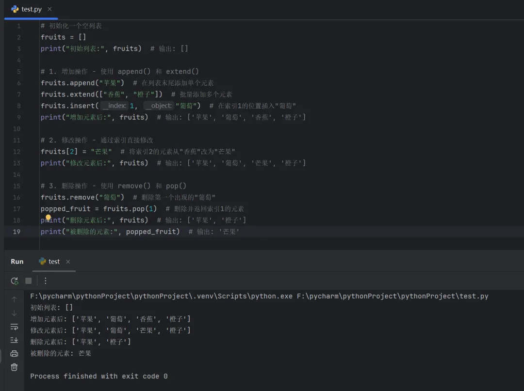 # 初始化一个空列表fruits = []print("初始列表:", fruits) # 输出: []# 1. 增加操作 - 使用 append() 和 extend()fruits.append("苹果") # 在列表末尾添加单个元素fruits.extend(["香蕉", "橙子"]) # 批量添加多个元素fruits.insert(1, "葡萄") # 在索引1的位置插入"葡萄"print("增加元素后:", fruits) # 输出: ['苹果', '葡萄', '香蕉', '橙子']# 2. 修改操作 - 通过索引直接修改fruits[2] = "芒果" # 将索引2的元素从"香蕉"改为"芒果"print("修改元素后:", fruits) # 输出: ['苹果', '葡萄', '芒果', '橙子']# 3. 删除操作 - 使用 remove() 和 pop()fruits.remove("葡萄") # 删除第一个出现的"葡萄"popped_fruit = fruits.pop(1) # 删除并返回索引1的元素print("删除元素后:", fruits) # 输出: ['苹果', '橙子']print("被删除的元素:", popped_fruit) # 输出: '芒果'