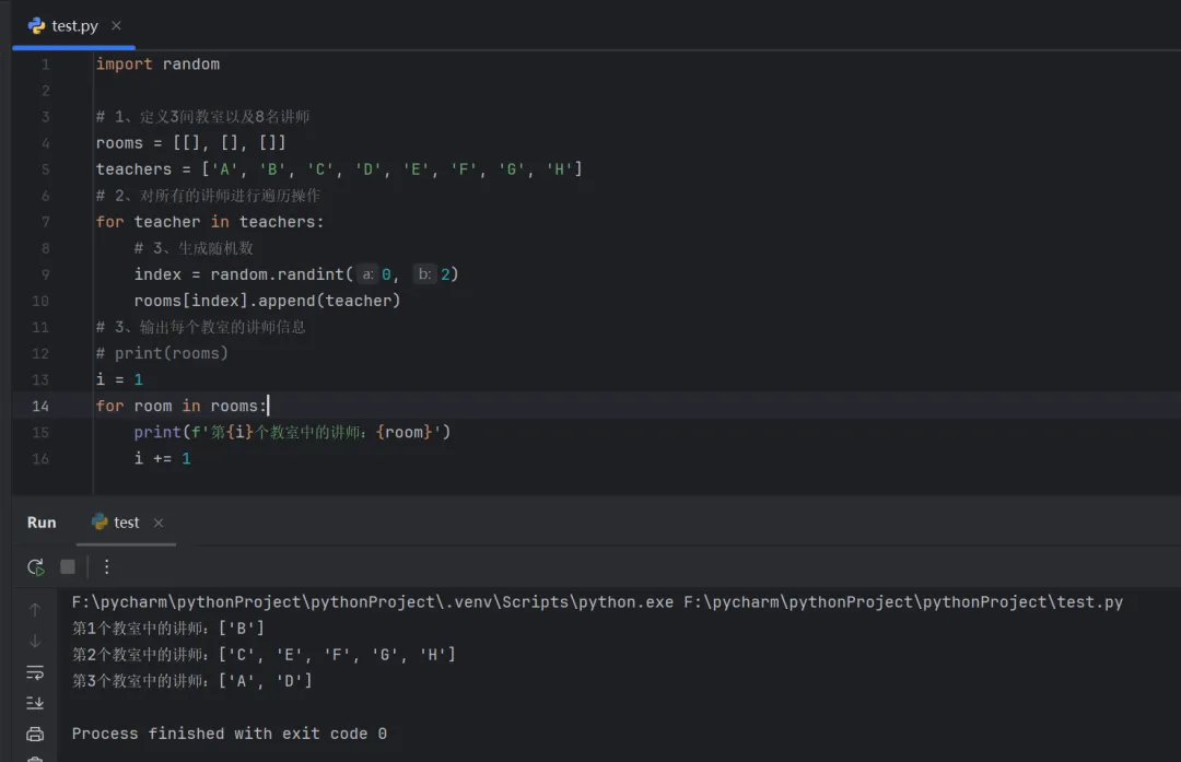 import random# 1、定义3间教室以及8名讲师rooms = [[], [], []]teachers = ['A', 'B', 'C', 'D', 'E', 'F', 'G', 'H']# 2、对所有的讲师进行遍历操作for teacher in teachers: # 3、生成随机数 index = random.randint(0, 2) rooms[index].append(teacher)# 3、输出每个教室的讲师信息# print(rooms)i = 1for room in rooms: print(f'第{i}个教室中的讲师:{room}') i += 1