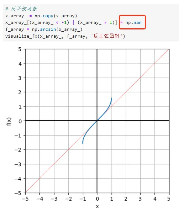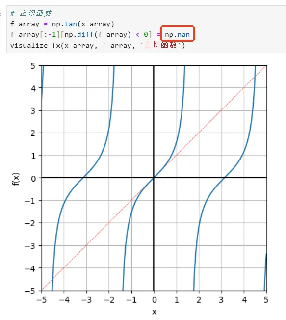 import numpy as npimport matplotlib.pyplot as plt# 自定义可视化函数def visualize_fx(x_array, f_array, title, step = False):fig, ax = plt.subplots(figsize = (5,5))ax.plot([-5,5],[-5,5], c = 'r', ls = '--', lw = 0.5)if step: # 使用“步长”绘图ax.step(x_array, f_array)else: # 使用“光滑的点”绘图ax.plot(x_array, f_array)ax.set_xlim(-5, 5)ax.set_ylim(-5, 5)ax.axvline(0, c = 'k')ax.axhline(0, c = 'k')ax.set_xticks(np.arange(-5, 5+1))ax.set_yticks(np.arange(-5, 5+1))ax.set_xlabel('x')ax.set_ylabel('f(x)')plt.grid(True)ax.set_aspect('equal', adjustable='box')fig.savefig(title + '.svg', format='svg')