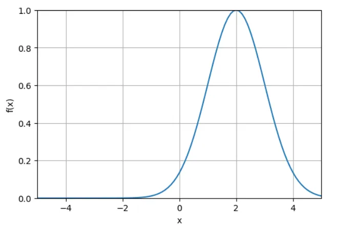 # 练习Q15-1 给定一元高斯函数,给出固定参数值,用Numpy和matplotlib可视化函数图像(线图)。# 以下是AI给我思考过程:# === 步骤1: 导入必要的库 ===import numpy as np # 计算import matplotlib.pyplot as plt # 绘图# === 步骤2: 定义函数参数 ===# 根据题目,参数值为:a=1, b=2, c=1 (题目给定的)a = 1b = 2c = 1# === 步骤3: 创建x轴数据 ===# 思考:使用什么“工具”?(.linspace())# 我们需要在哪个范围内采样x值?(-6, 6)# 取多少个点比较合适?(121)x_array = np.linspace(-6, 6, 121)# === 步骤4: 计算y轴数据 ===# 这是最关键的一步!需要将数学公式转换为NumPy代码# 公式:f(x) = a * exp(-(x - b)² / (2 * c²))# 分步计算(帮助理解):# 1. 先计算 (x - b)diff = x_array - b# 2. 计算 (x - b)²diff_squared = diff ** 2 # 【填上正确的幂次】# 3. 计算分母 2 * c²denominator = 2 * (c ** 2 ) # 【填上正确的幂次】# 4. 计算指数部分:-diff_squared / denominatorexponent = -diff_squared / denominator# 5. 计算整个函数值f_x_array = a * np.exp(exponent) # 【填上正确的NumPy函数(.exp())】# 注意:.exp()这个函数表示以 e(自然常数)为底数,x为指数的幂运算。# 也可以一步完成(挑战!):# f_x_array = a * np.exp(-((x_array - b) ** 2 ) / (2 * c ** 2 ))# === 步骤5: 创建图形 ===# 思考:图形尺寸设置为多少合适?(6, 4)fig, ax = plt.subplots(figsize=(6, 4))# 绘制线图# 思考:plot函数需要什么参数?(x = x_array; y = f(x_array))ax.plot(x_array, f_x_array) # 【填写x和y的数据(注意y轴的表达方式,妙呀)】# === 步骤6: 设置坐标轴 ===# 设置x轴范围# 思考:为什么设置为-5到5而不是-6到6?(因为x轴用不上-6和6的区域吗?这样可以使得画面更集中?)ax.set_xlim(-5, 5) # 【填写x轴范围】# 设置y轴范围# 思考:为什么y轴从0开始?# 思考:为什么要用f_x_array.max()作为上限?(因为这样可以不用人为操控y轴的上限吗?)ax.set_ylim(0, f_x_array.max()) # 【填写正确的方法】# === 步骤7: 添加标签和网格 ===# 设置x轴标签ax.set_xlabel('x') # 【填写标签文本】# 设置y轴标签ax.set_ylabel('f(x)') # 【填写标签文本】# 添加网格plt.grid() # 【填写正确的方法】# === 步骤8: 显示图形 ===plt.show()