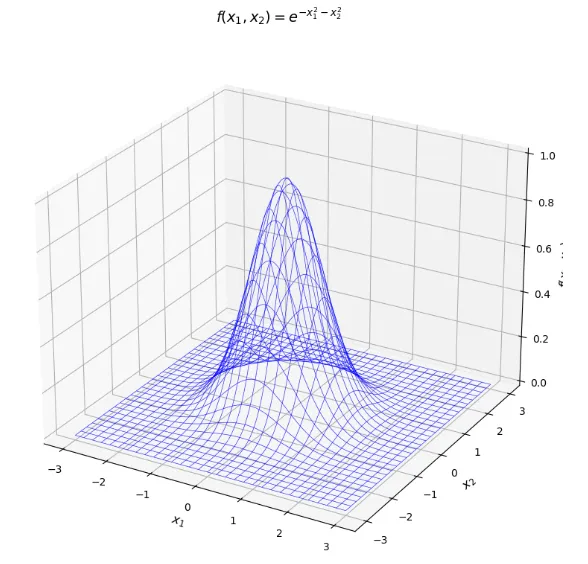 # === 步骤1: 导入必要的库 ===import numpy as npimport matplotlib.pyplot as pltfrom mpl_toolkits.mplot3d import Axes3D # 导入3D绘图模块# === 步骤2: 创建x1和x2的数据点 ===# 创建x1数组,范围-3到3,包含301个点x1_array = np.linspace(-3, 3, 301) # 【填空:点数量】# 创建x2数组,同样的范围和点数x2_array = np.linspace(-3, 3, 301) # 【填空:起始值和结束值】# === 步骤3: 生成网格 ===# 思考:为什么要用meshgrid?它返回什么?-> meshgrid将两个一维数组转换为二维网格xx1, xx2 = np.meshgrid(x1_array, x2_array) # 【填空:函数名】# 打印验证形状print(f"xx1的形状: {xx1.shape}")print(f"xx2的形状: {xx2.shape}")# === 步骤4: 计算函数值 ===# 根据公式 f(x1,x2) = exp(-x1² - x2²) 计算ff = np.exp( -xx1**2 - xx2**2 ) # 别忘了.exp前面的“np”# === 步骤5: 创建三维图形 ===# 创建图形对象fig = plt.figure(figsize=(10, 8))# 添加3D子图# 思考:为什么用projection参数?-> 因为要设置投影类型啊ax = fig.add_subplot(projection='3d') # 【填空:子图位置和投影类型】# === 步骤6: 绘制三维曲面 ===# 使用plot_wireframe绘制网格曲面# 思考:rstride和cstride参数的作用是什么?-> 它们控制网格的密度,值越大网格越稀疏ax.plot_wireframe(xx1, xx2, ff,rstride=10, # 【填空:行步长】cstride=10, # 【填空:列步长】color='blue', # 网格线颜色linewidth=0.5, # 网格线宽度alpha=0.8) # 透明度# === 步骤7: 设置坐标轴标签 ===# 设置x轴标签,使用LaTeX公式表示ax.set_xlabel(r'$x_1$', fontsize=12)# 设置y轴标签ax.set_ylabel(r'$x_2$', fontsize=12) # 【填空:变量名】# 设置z轴标签(f(x_1, x_2))ax.set_zlabel(r'$f(x_1, x_2)$', fontsize=12)# 设置标题ax.set_title('$f(x_1,x_2)=e^{-x_1^2-x_2^2}$', fontsize=14, fontweight='bold')# === 步骤8: 调整图形布局和视角 ===# 调整布局plt.tight_layout()# 设置视角(可选,但可以让图形更好看)# 思考:elev和azim参数分别控制什么?# 提示:elev是仰角,azim是方位角ax.view_init(elev=25, azim=-60) # 调整视角# === 步骤9: 显示图形 ===plt.show()