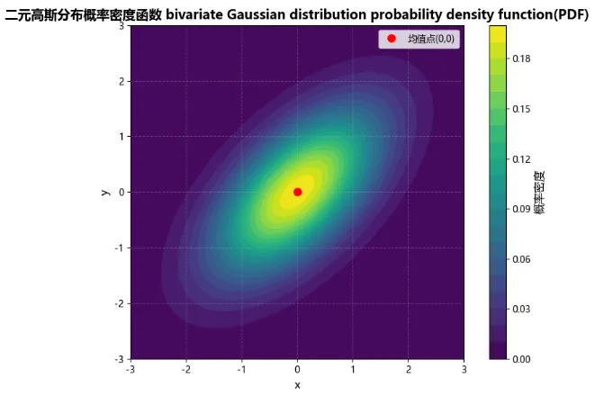 # === 步骤1: 导入必要的库 ===import numpy as npimport matplotlib.pyplot as pltimport matplotlibmatplotlib.rcParams['font.sans-serif'] = ['Microsoft YaHei', 'SimHei', 'SimSun']matplotlib.rcParams['axes.unicode_minus'] = False# === 步骤2: 设置参数 ===# 根据题目要求设置参数值(这部分题目已经给出了具体数值)# 提示:通常均值设为0,标准差设为1,相关系数设为某个值mu_X = 0 # 【填空:x的均值】mu_Y = 0 # 【填空:y的均值】sigma_X = 1 # 【填空:x的标准差】sigma_Y = 1 # 【填空:y的标准差】rho_XY = 0.6 # 【填空:相关系数】# === 步骤3: 创建网格数据 ===# 创建x和y的取值数组# 思考:范围应该多大?取多少个点?# 提示:通常范围是[-3, 3]或根据标准差决定x_array = np.linspace(-3, 3, 201) # 【填空:点数量,如201】y_array = np.linspace(-3, 3, 201) # 【填空:同样的点数量】# 生成网格,用meshgridxx1, xx2 = np.meshgrid(x_array, y_array) # 【填空:网格生成函数】# === 步骤4: 定义概率密度函数 ===def f_XYPDF(xx1, xx2, sigma_X, sigma_Y, rho_XY, mu_X, mu_Y):"""计算二元高斯分布的概率密度参数:xx1, xx2: 网格坐标其他: 分布参数"""# 4.1 计算归一化系数(公式左边比较复杂的“分数”部分)# 公式中的系数: 1/(2π * σ_X * σ_Y * √(1-ρ²))# 下面就是将公式“翻译”为Numpy代码的过程coeff = 2 * np.pi * sigma_X * sigma_Y * np.sqrt(1 - rho_XY**2)coeff = 1 / coeff # 【填空:计算倒数】# 4.2 标准化变量# 将xx1标准化: (x - μ_X)/σ_Xxx1_std = (xx1 - mu_X) / sigma_X # 【填空:分母】xx2_std = (xx2 - mu_Y) / sigma_Y # 【填空:分母】# 4.3 计算椭圆项(指数部分)# 公式: 1/(1-ρ²) * [xx1_std² - 2ρ*xx1_std*xx2_std + xx2_std²]ellipse = 1/(1 - rho_XY**2) * (xx1_std**2 - 2 * rho_XY * xx1_std * xx2_std + xx2_std**2)# 4.4 计算概率密度(即将公式两边的数,用“np.exp”链接在一起)PDF = coeff * np.exp(-1/2 * ellipse) # 【填空:指数函数】return PDF# === 步骤5: 计算概率密度 ===# 调用函数计算整个网格上的概率密度PDF_ff = f_XYPDF(xx1, xx2, sigma_X, sigma_Y, rho_XY, mu_X, mu_Y)# === 步骤6: 创建图形 ===# 创建图形和坐标轴fig, ax = plt.subplots(figsize=(8, 6)) # 【填空:图形尺寸,如(8, 6)】# === 步骤7: 绘制等高线图 ===# 使用contourf绘制填充等高线图contour = ax.contourf(xx1, xx2, PDF_ff,levels=20, # 等高线数量cmap='viridis') # 颜色映射# === 步骤8: 添加颜色条 ===# 添加颜色条显示数值对应关系cbar = fig.colorbar(contour, ax=ax)cbar.set_label('概率密度', fontsize=12)# === 步骤9: 设置坐标轴 ===# 设置x轴范围ax.set_xlim(-3, 3)# 设置y轴范围ax.set_ylim(-3, 3)# 设置坐标轴标签ax.set_xlabel('x', fontsize=12)ax.set_ylabel('y', fontsize=12)# 添加标题ax.set_title('二元高斯分布概率密度函数 bivariate Gaussian distribution probability density function(PDF)', fontsize=14, fontweight='bold')# === 步骤10: 添加网格和设置比例 ===# 添加网格ax.grid(True, alpha=0.3, linestyle='--')# 设置等比例,保证图形不变形ax.set_aspect('equal', adjustable='box')# 标记均值点ax.plot(mu_X, mu_Y, 'ro', markersize=8, label=f'均值点({mu_X},{mu_Y})')ax.legend()# === 步骤11: 显示图形 ===plt.tight_layout()plt.show()
