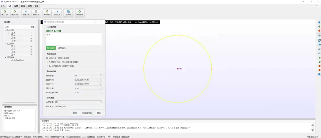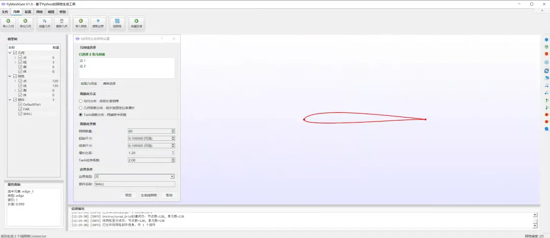 参数设置:- 离散化方法:tanh- 起始尺寸:0.1- 结束尺寸:0.2- tanh因子:2.0线网格生成支持多种边界条件类型,系统会自动识别和规范化: