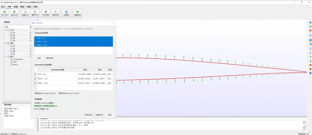 区域创建是网格生成的关键步骤,通过将多条Connector组合形成封闭区域,为后续的面网格生成提供边界条件。PyMeshGen提供了直观的区域创建界面,支持多连通域和方向控制。