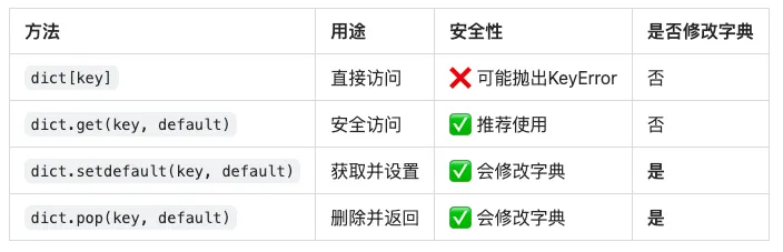 - dict.get():最安全,生产环境首选 ⭐⭐⭐⭐⭐