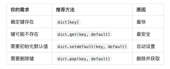 # 1. 默认使用 get() 方法value = my_dict.get('key', default_value)# 2. 需要初始化时使用 setdefault()my_dict.setdefault('key', default_value)# 3. 需要删除时使用 pop()removed_value = my_dict.pop('key', None)