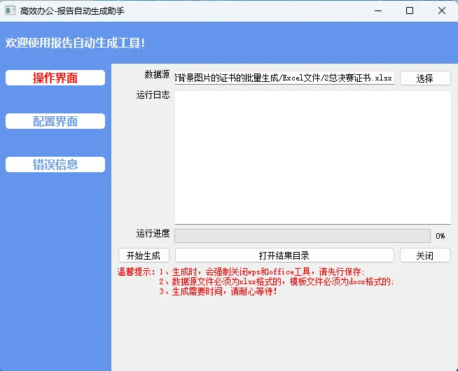 - 操作页:点几下就能选 Excel 数据源、看生成进度、一键打开结果文件夹;