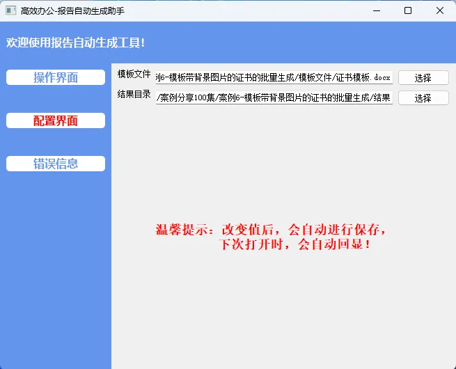 - 配置页:设置模板路径、输出目录,改完自动保存,下次打开直接用;