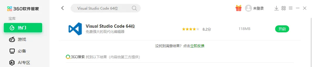 通过360软件管家或官网搜索“Visual Studio Code 64位”,下载并完成安装,该编辑器免费且功能强大,适配Python代码编写与运行。