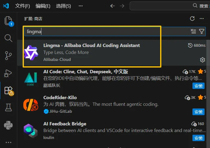 打开VS Code后,进入左侧“扩展”商店,分别搜索“Python”和“Lingma”(通义灵码扩展),找到对应扩展后点击“安装”,等待安装完成后重启VS Code生效(优先选择Microsoft官方发布的Python扩展,确保兼容性)。