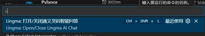 在VS Code中,按下快捷键 Ctrl+SHIFT+P,弹出命令输入框,输入“Lingma”,在搜索结果中点击“Lingma: 打开/关闭通义灵码智能问答”,启动通义灵码插件。
