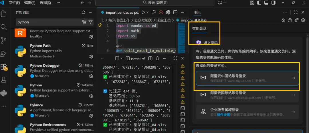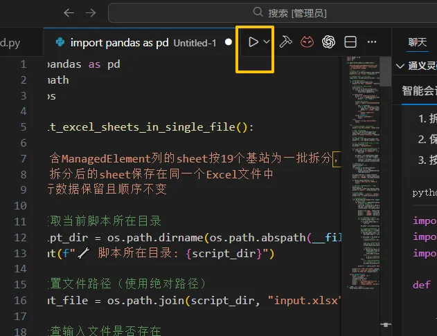 2. 将修改后的新脚本复制到VS Code的文件中,覆盖原有代码后重新运行,重复此操作直至代码正常运行、拆分结果正确;