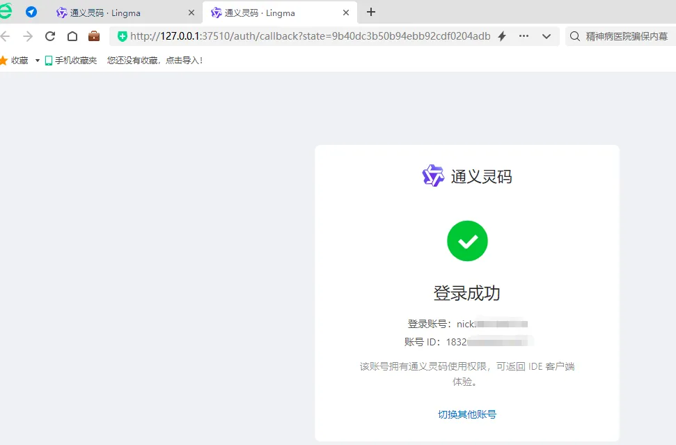启动通义灵码后,点击插件界面的“登录”按钮,会自动跳转至通义灵码官方登录页面,按照提示完成阿里云账号的注册(已有账号可直接登录)。登录成功后,页面会提示“该账号拥有通义灵码使用权限,可返回IDE客户端体验”,此时返回VS Code即可。