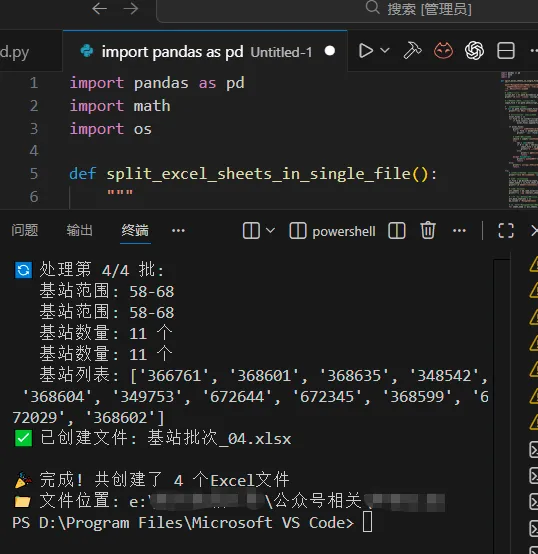 3. 查看运行状态:终端中会实时显示拆分进度,包括当前处理批次、基站范围、基站数量、基站列表,以及生成文件的名称和保存路径,直至终端提示“完成”,即表示代码运行结束。