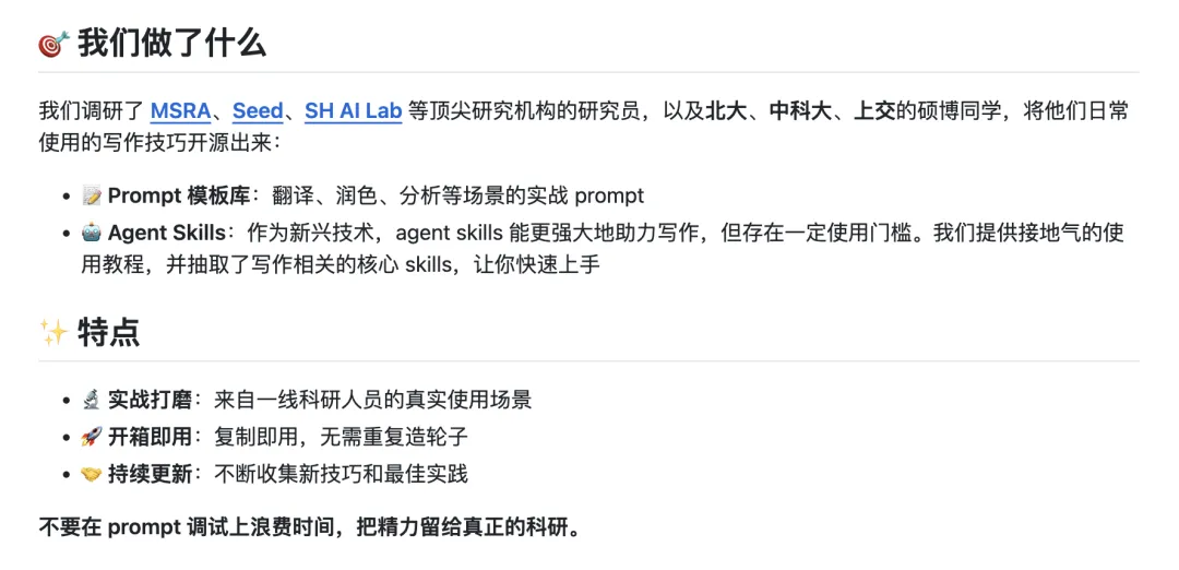 该项目调研了 MSRA、字节 Seed、上海人工智能实验室等机构研究员,以及 北大、中科大、上交硕博群体的日常写作习惯,将一套覆盖 idea 萌发到 camera-ready 全周期的科研写作方案开源了出来。