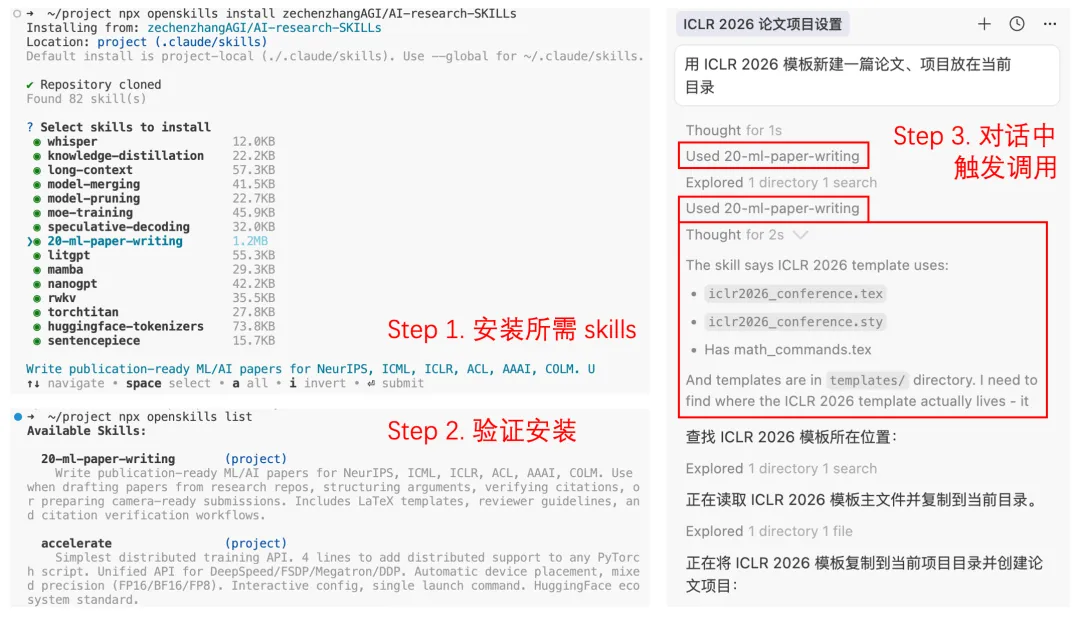 这是该项目最硬核的功能。借助 20-ml-paper-writing Skill,Agent 不再是一个聊天机器人,而是一个能读懂代码的合作者。