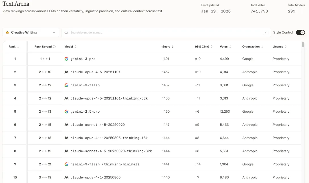 Agent 的效果高度依赖底层模型的能力。根据 arena.ai 的 Creative Writing 榜单及科研实战反馈,项目给出了明确的模型红黑榜: