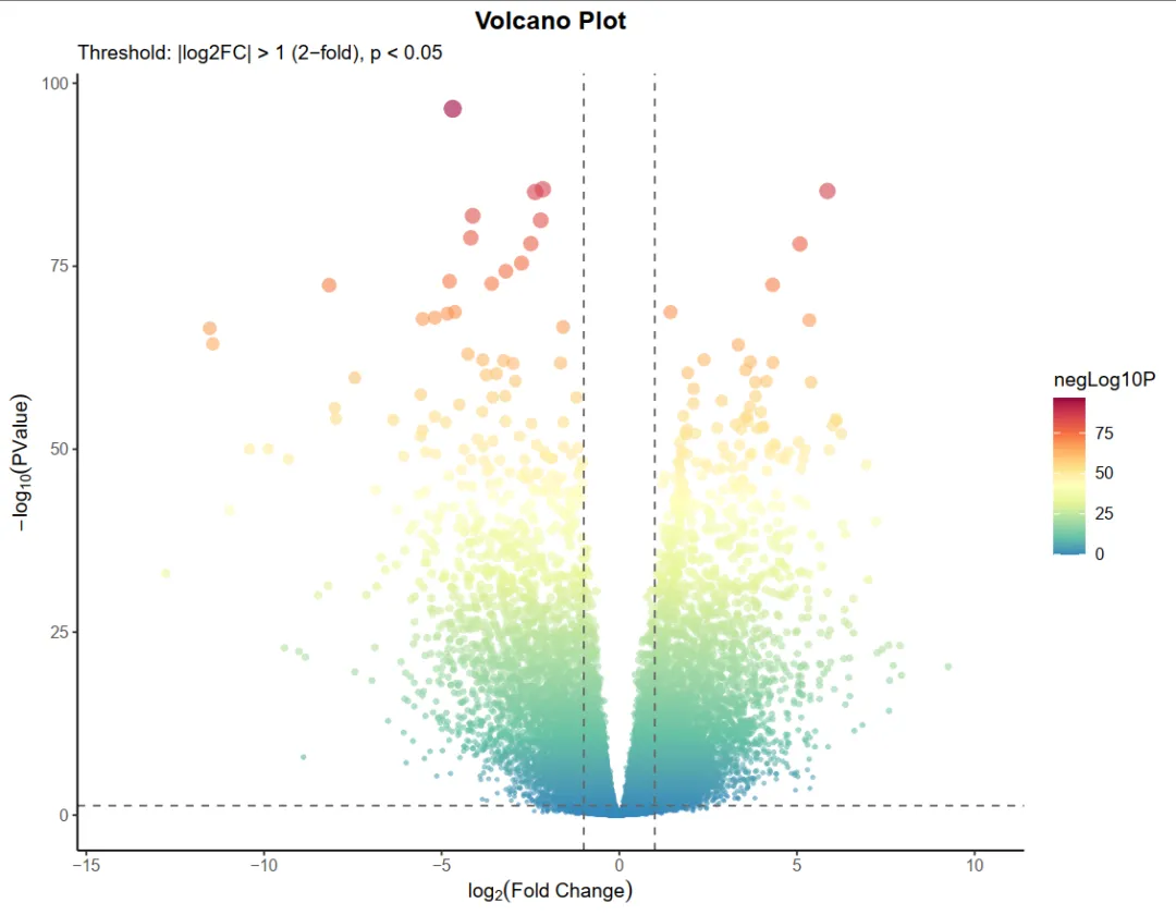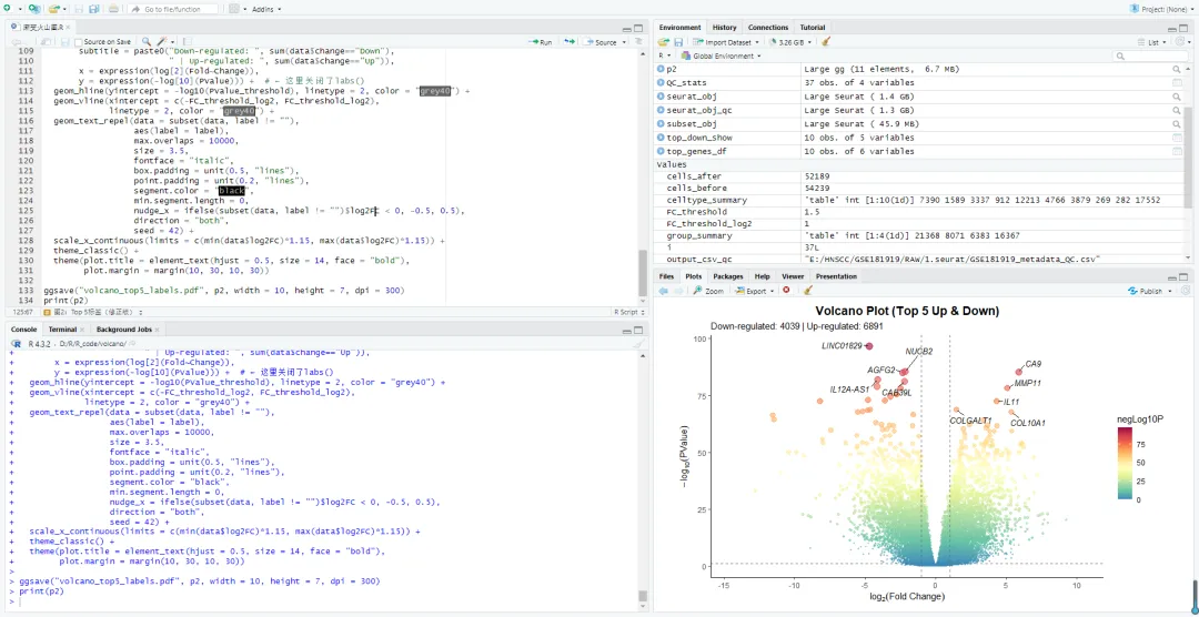 # 渐变火山图绘制 - logFC已是log2转换值# 数据范围:-11.52 到 7.9library(ggplot2)library(ggrepel)library(tidyverse)setwd("D:/R/R_code/volcano")data = read.csv("volcano.csv")# ==================== 直接使用log2FC ====================data <- data %>% mutate( log2FC = logFC, # 您的logFC已是log2值,直接使用 negLog10P = -1 * log10(pvalue) )cat("log2FC范围:", round(min(data$log2FC), 2), "到", round(max(data$log2FC), 2), "\n")cat("对应倍数变化:", round(2^min(data$log2FC)), "倍下调 到 ", round(2^max(data$log2FC)), "倍上调\n")# ==================== 阈值设置 ====================# 建议用1(对应2倍变化)或0.585(对应1.5倍),根据您的数据范围调整FC_threshold_log2 = 1.0 # log2(2) = 1,即2倍变化阈值# 如果基因太多/太少,可以改为 0.585 (1.5倍) 或 1.585 (3倍)PValue_threshold = 0.05# 定义差异类型data <- data %>% mutate( change = case_when( log2FC > FC_threshold_log2 & pvalue < PValue_threshold ~ "Up", log2FC < -FC_threshold_log2 & pvalue < PValue_threshold ~ "Down", TRUE ~ "NotSig" ) )cat("\n差异基因统计(|log2FC| >", FC_threshold_log2, "且 p <", PValue_threshold, "):\n")print(table(data$change))# 查看下调基因分布down_stats <- data %>% filter(change == "Down") %>% summarise( n = n(), min_log2FC = min(log2FC), max_log2FC = max(log2FC), median_log2FC = median(log2FC) )cat("\n下调基因统计:\n")print(down_stats)# ==================== 筛选Top 5(排除NotSig)====================top5_up <- data %>% filter(change == "Up") %>% arrange(pvalue) %>% head(5) %>% pull(gene)top5_down <- data %>% filter(change == "Down") %>% arrange(pvalue) %>% head(5) %>% pull(gene)cat("\nTop 5 上调:", paste(top5_up, collapse = ", "), "\n")cat("Top 5 下调:", paste(top5_down, collapse = ", "), "\n")# 检查这些基因的值cat("\nTop 5 下调基因详细信息:\n")print(data %>% filter(gene %in% top5_down) %>% select(gene, log2FC, pvalue, negLog10P))# ==================== 图1:无标签 ====================data$label <- ""p1 <- ggplot(data, aes(x = log2FC, y = negLog10P)) + geom_point(aes(color = negLog10P, size = negLog10P), alpha = 0.6) + scale_color_gradientn(colors = c("#3288BD", "#66C2A5", "#ABDDA4", "#E6F598", "#FFFFBF", "#FEE08B", "#FDAE61", "#F46D43", "#D53E4F", "#9E0142")) + scale_radius(range = c(0.5, 4), guide = "none") + labs(title = "Volcano Plot", subtitle = paste0("Threshold: |log2FC| > ", FC_threshold_log2, " (", round(2^FC_threshold_log2, 1), "-fold), p < ", PValue_threshold), x = expression(log[2](Fold~Change)), y = expression(-log[10](PValue))) + geom_hline(yintercept = -log10(PValue_threshold), linetype = 2, color = "grey40") + geom_vline(xintercept = c(-FC_threshold_log2, FC_threshold_log2), linetype = 2, color = "grey40") + # X轴范围设置,确保两侧都显示清楚 scale_x_continuous(limits = c(min(data$log2FC)*1.1, max(data$log2FC)*1.1)) + theme_classic() + theme(plot.title = element_text(hjust = 0.5, size = 14, face = "bold"))ggsave("volcano_no_labels.pdf", p1, width = 9, height = 7, dpi = 300)print(p1)# ==================== 图2:Top 5标签(修正版)====================data$label <- ifelse(data$gene %in% c(top5_up, top5_down), as.character(data$gene), "")p2 <- ggplot(data, aes(x = log2FC, y = negLog10P)) + geom_point(aes(color = negLog10P, size = negLog10P), alpha = 0.6) + scale_color_gradientn(colors = c("#3288BD", "#66C2A5", "#ABDDA4", "#E6F598", "#FFFFBF", "#FEE08B", "#FDAE61", "#F46D43", "#D53E4F", "#9E0142")) + scale_radius(range = c(0.5, 4), guide = "none") + labs(title = "Volcano Plot (Top 5 Up & Down)", subtitle = paste0("Down-regulated: ", sum(data$change=="Down"), " | Up-regulated: ", sum(data$change=="Up")), x = expression(log[2](Fold~Change)), y = expression(-log[10](PValue))) + # ← 这里关闭了labs() geom_hline(yintercept = -log10(PValue_threshold), linetype = 2, color = "grey40") + geom_vline(xintercept = c(-FC_threshold_log2, FC_threshold_log2), linetype = 2, color = "grey40") + geom_text_repel(data = subset(data, label != ""), aes(label = label), max.overlaps = 10000, size = 3.5, fontface = "italic", box.padding = unit(0.5, "lines"), point.padding = unit(0.2, "lines"), segment.color = "black", min.segment.length = 0, nudge_x = ifelse(subset(data, label != "")$log2FC < 0, -0.5, 0.5), direction = "both", seed = 42) + scale_x_continuous(limits = c(min(data$log2FC)*1.15, max(data$log2FC)*1.15)) + theme_classic() + theme(plot.title = element_text(hjust = 0.5, size = 14, face = "bold"), plot.margin = margin(10, 30, 10, 30))ggsave("volcano_top5_labels.pdf", p2, width = 10, height = 7, dpi = 300)print(p2)
