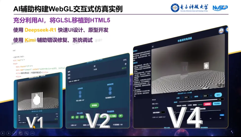 展示了“基于路径追踪算法的布儒斯特角测量实验”。付博士详细介绍了如何利用AI将底层复杂的代码迁移至HTML5平台,并构建出多功能的双语交互界面。他特别提到了“多AI组合”的策略:以DeepSeek作为主力处理复杂推理,配合Kimi等AI进行视觉转换和即时修改,从而避免单一AI陷入思维“牛角尖”。