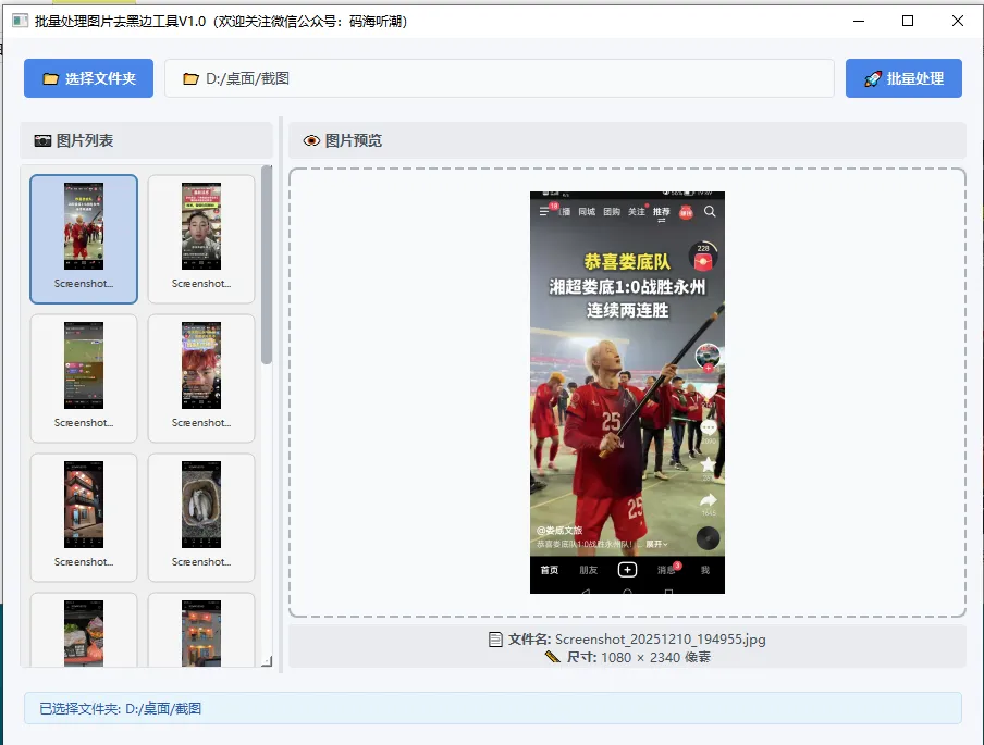 import sysimport osfrom pathlib import Pathfrom PyQt6.QtWidgets import (QMainWindow, QWidget, QVBoxLayout, QHBoxLayout, QPushButton, QLabel, QFileDialog, QProgressBar, QMessageBox, QScrollArea, QSplitter, QApplication, QGridLayout)from PyQt6.QtCore import (Qt, pyqtSignal, QSize, QRect)from PyQt6.QtGui import (QPainter, QColor, QPen, QImage, QPixmap, QFont)class ThumbnailWidget(QWidget): """缩略图小部件 - 修复点击事件""" clicked = pyqtSignal(str) def __init__(self, image_path, parent=None): super().__init__(parent) self.image_path = image_path self.is_selected = False self.setFixedSize(100, 120) # 缩小尺寸 # 设置鼠标悬停和点击效果 self.setMouseTracking(True) def paintEvent(self, event): painter = QPainter(self) painter.setRenderHint(QPainter.RenderHint.Antialiasing) # 绘制背景 if self.is_selected: painter.setBrush(QColor(100, 149, 237, 80)) # 选中时更明显的背景色 painter.setPen(QPen(QColor(70, 130, 180), 2)) else: painter.setBrush(QColor(245, 245, 245)) painter.setPen(QPen(QColor(200, 200, 200), 1)) painter.drawRoundedRect(1, 1, self.width()-2, self.height()-2, 6, 6) # 绘制缩略图 try: # 检查文件是否存在 if os.path.exists(self.image_path): # 使用QImage加载图片 img = QImage(self.image_path) if not img.isNull(): # 缩放图片以适合缩略图区域 scaled_img = img.scaled(80, 80, Qt.AspectRatioMode.KeepAspectRatio, Qt.TransformationMode.SmoothTransformation) # 居中显示缩略图 x = (self.width() - scaled_img.width()) // 2 y = 8 painter.drawImage(x, y, scaled_img) # 绘制文件名 painter.setPen(QColor(60, 60, 60)) font = painter.font() font.setPointSize(7) font.setFamily("Microsoft YaHei") painter.setFont(font) file_name = os.path.basename(self.image_path) if len(file_name) > 12: file_name = file_name[:10] + "..." # 使用drawText绘制文本,确保在区域内 painter.drawText(QRect(0, 90, self.width(), 20), Qt.AlignmentFlag.AlignCenter | Qt.TextFlag.TextWordWrap, file_name) else: # 文件不存在时显示提示 painter.setPen(QColor(200, 100, 100)) painter.drawText(self.rect(), Qt.AlignmentFlag.AlignCenter, "图片丢失") except Exception as e: print(f"绘制缩略图时出错: {e}") painter.setPen(QColor(200, 100, 100)) painter.drawText(self.rect(), Qt.AlignmentFlag.AlignCenter, "加载失败") def mousePressEvent(self, event): if event.button() == Qt.MouseButton.LeftButton: # 确保图片路径有效 if os.path.exists(self.image_path): self.clicked.emit(self.image_path) else: print(f"图片不存在: {self.image_path}") event.accept() def enterEvent(self, event): if not self.is_selected: self.setCursor(Qt.CursorShape.PointingHandCursor) super().enterEvent(event) def leaveEvent(self, event): self.unsetCursor() super().leaveEvent(event)class MainWindow(QMainWindow): def __init__(self): super().__init__() self.setWindowTitle("批量处理图片去黑边工具V1.0(欢迎关注微信公众号:码海听潮)") self.setGeometry(100, 100, 900, 650) # 缩小主窗口尺寸 self.folder_path = None self.image_files = [] self.actual_image_files = [] # 实际有效的图片文件列表 self.current_preview_image = None self.init_ui() self.apply_stylesheet() def init_ui(self): # 创建中央部件 central_widget = QWidget() self.setCentralWidget(central_widget) main_layout = QVBoxLayout(central_widget) main_layout.setSpacing(8) main_layout.setContentsMargins(10, 10, 10, 10) # 顶部工具栏 toolbar = QWidget() toolbar.setMaximumHeight(60) toolbar_layout = QHBoxLayout(toolbar) toolbar_layout.setSpacing(10) # 选择文件夹按钮 self.select_folder_btn = QPushButton("📁 选择文件夹") self.select_folder_btn.clicked.connect(self.select_folder) self.select_folder_btn.setMinimumHeight(36) self.select_folder_btn.setIconSize(QSize(20, 20)) toolbar_layout.addWidget(self.select_folder_btn) # 文件夹路径显示 self.folder_label = QLabel("未选择文件夹") self.folder_label.setStyleSheet(""" padding: 8px 12px; background-color: #f8f9fa; border: 1px solid #dee2e6; border-radius: 4px; color: #495057; font-size: 13px; """) self.folder_label.setMinimumHeight(36) toolbar_layout.addWidget(self.folder_label, 1) # 处理按钮 self.process_btn = QPushButton("🚀 批量处理") self.process_btn.clicked.connect(self.process_images) self.process_btn.setMinimumHeight(36) self.process_btn.setEnabled(False) toolbar_layout.addWidget(self.process_btn) main_layout.addWidget(toolbar) # 创建分割器 splitter = QSplitter() splitter.setStyleSheet("QSplitter::handle { background-color: #dee2e6; }") # 左侧图片列表区域(缩小比例) left_widget = QWidget() left_layout = QVBoxLayout(left_widget) left_layout.setSpacing(5) left_layout.setContentsMargins(5, 5, 5, 5) # 图片列表标题 list_title = QLabel("📷 图片列表") list_title.setStyleSheet(""" font-size: 13px; font-weight: bold; padding: 8px; background-color: #e9ecef; border-radius: 4px; color: #495057; """) left_layout.addWidget(list_title) # 图片列表容器 self.list_container = QScrollArea() self.list_container.setWidgetResizable(True) self.list_container.setHorizontalScrollBarPolicy(Qt.ScrollBarPolicy.ScrollBarAlwaysOff) self.list_container.setStyleSheet(""" QScrollArea { border: 1px solid #dee2e6; border-radius: 4px; background-color: white; } QScrollBar:vertical { width: 10px; background-color: #f8f9fa; } QScrollBar::handle:vertical { background-color: #adb5bd; border-radius: 4px; min-height: 20px; } """) self.list_widget = QWidget() self.list_layout = QGridLayout(self.list_widget) self.list_layout.setSpacing(8) self.list_layout.setAlignment(Qt.AlignmentFlag.AlignTop) self.list_layout.setContentsMargins(8, 8, 8, 8) self.list_container.setWidget(self.list_widget) left_layout.addWidget(self.list_container) # 右侧预览区域(增大比例) right_widget = QWidget() right_layout = QVBoxLayout(right_widget) right_layout.setSpacing(8) right_layout.setContentsMargins(5, 5, 5, 5) # 预览标题 preview_title = QLabel("👁️ 图片预览") preview_title.setStyleSheet(""" font-size: