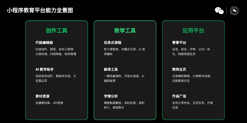 作为以中国原创小程序为核心的项目式人工智能学习实践平台,小程序教育平台已连续5年迭代,持续为师生免费提供“学AI、用AI、教AI”的教学全流程能力。