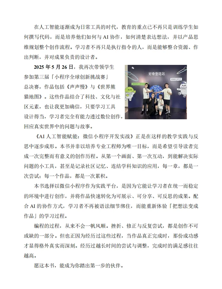 在与内地及港澳教师的交流中,郑文健发现了一个痛点:许多老师想教AI,却苦于对低门槛工具不了解。为了解决这个问题,他“硬核”地自编了一本教材——《AI人工智能赋能:微信小程序开发实战》。教材涵盖了AI编程思维介绍、小程序全流程创建、多类型案例实践、作品回顾等版块,不止于实践记录,更是引导学习者重新体验「把想法变成作品」。